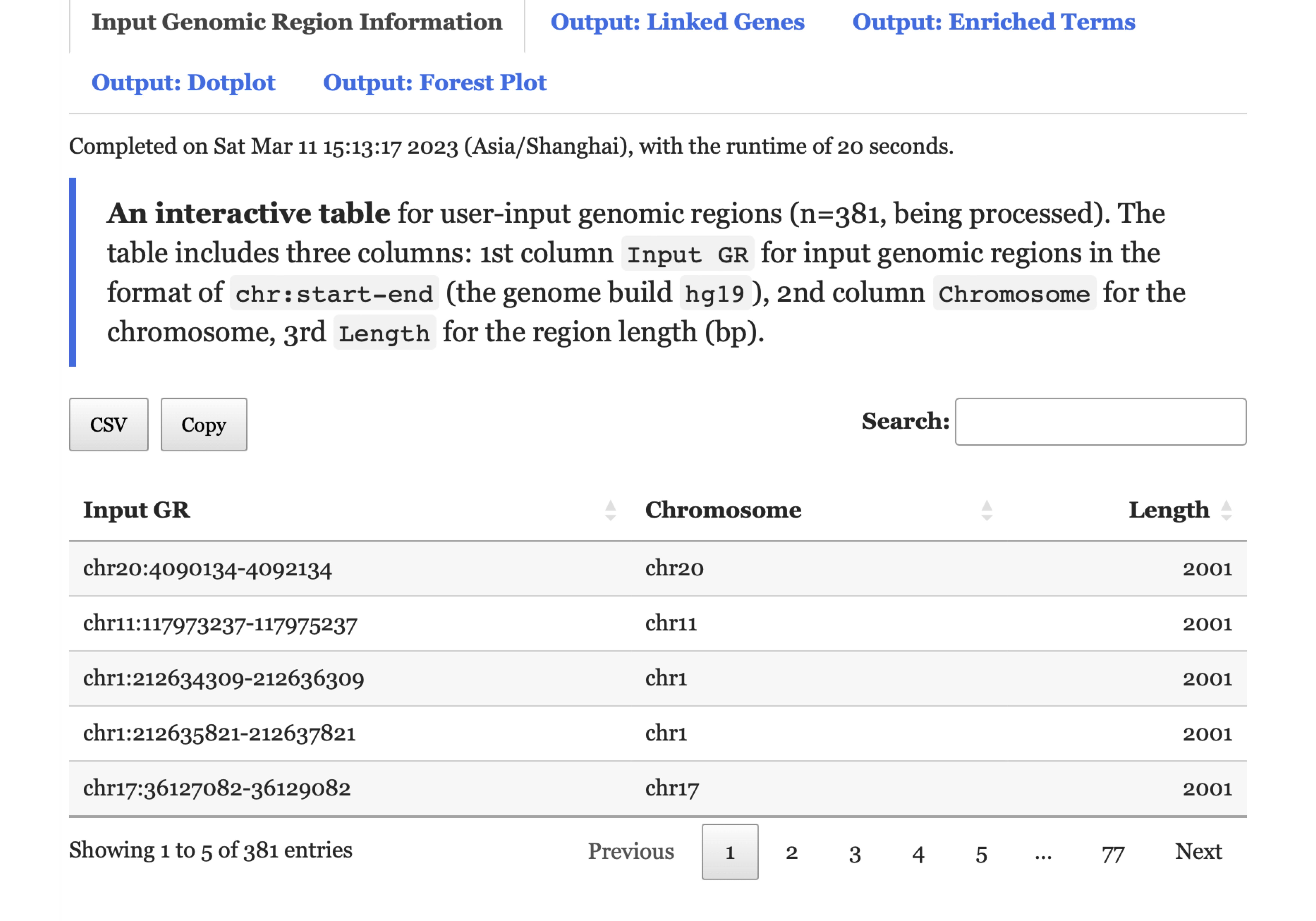 Input Genomic Region Informationtab,An interactive tablelists user-input genomic regions.