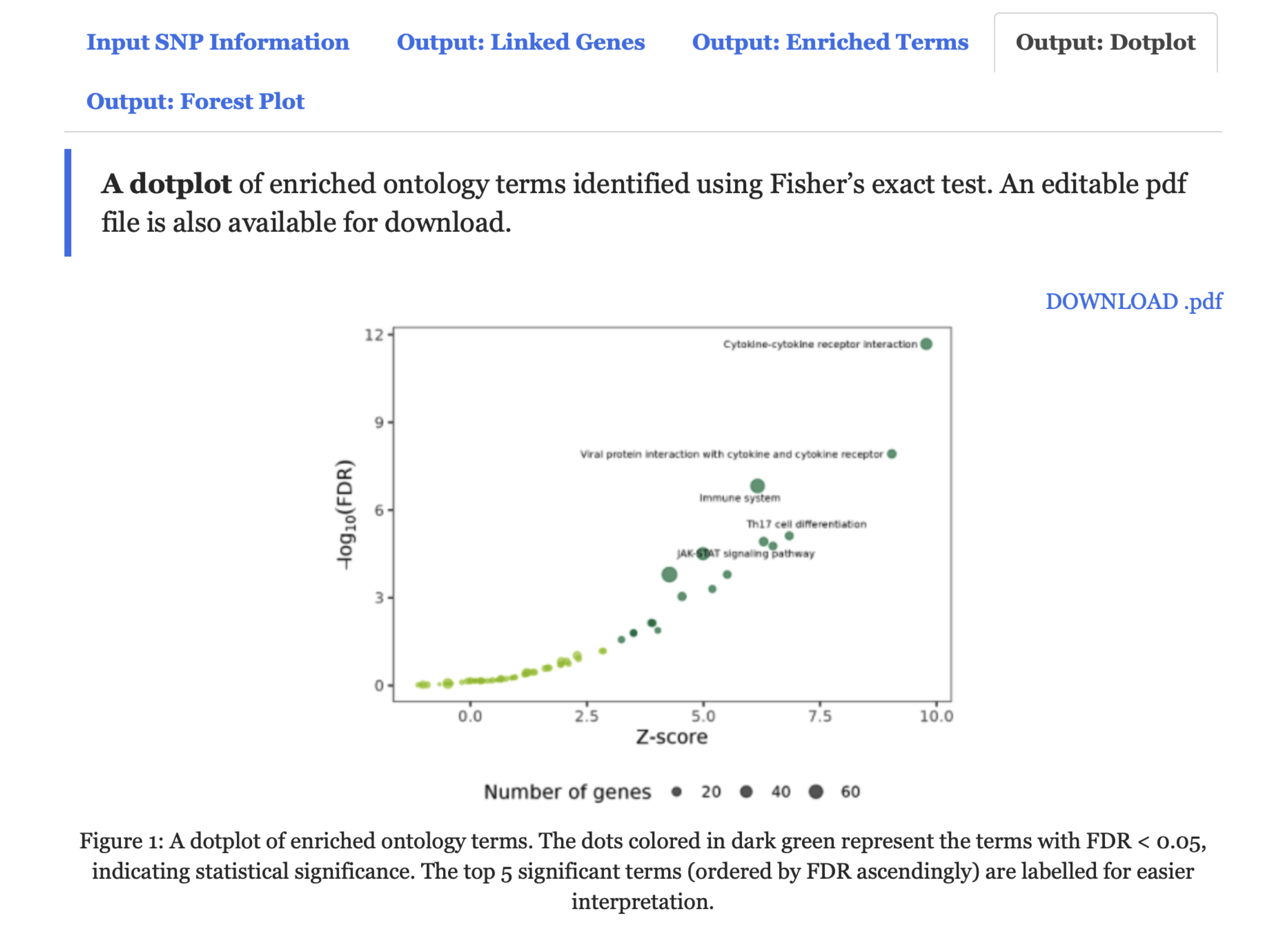 Output: Forest Plottab,A forest plotillustrates enriched ontology terms. A downloadable pdf file is also provided.